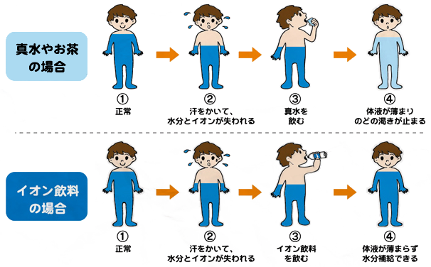 塩分(イオン)が失われたままの状態で水分だけ補給しても浸透圧が下がり過ぎ体液が薄くなるのを避ける為体の中に水を十分に取り込むことが出来なくなります。