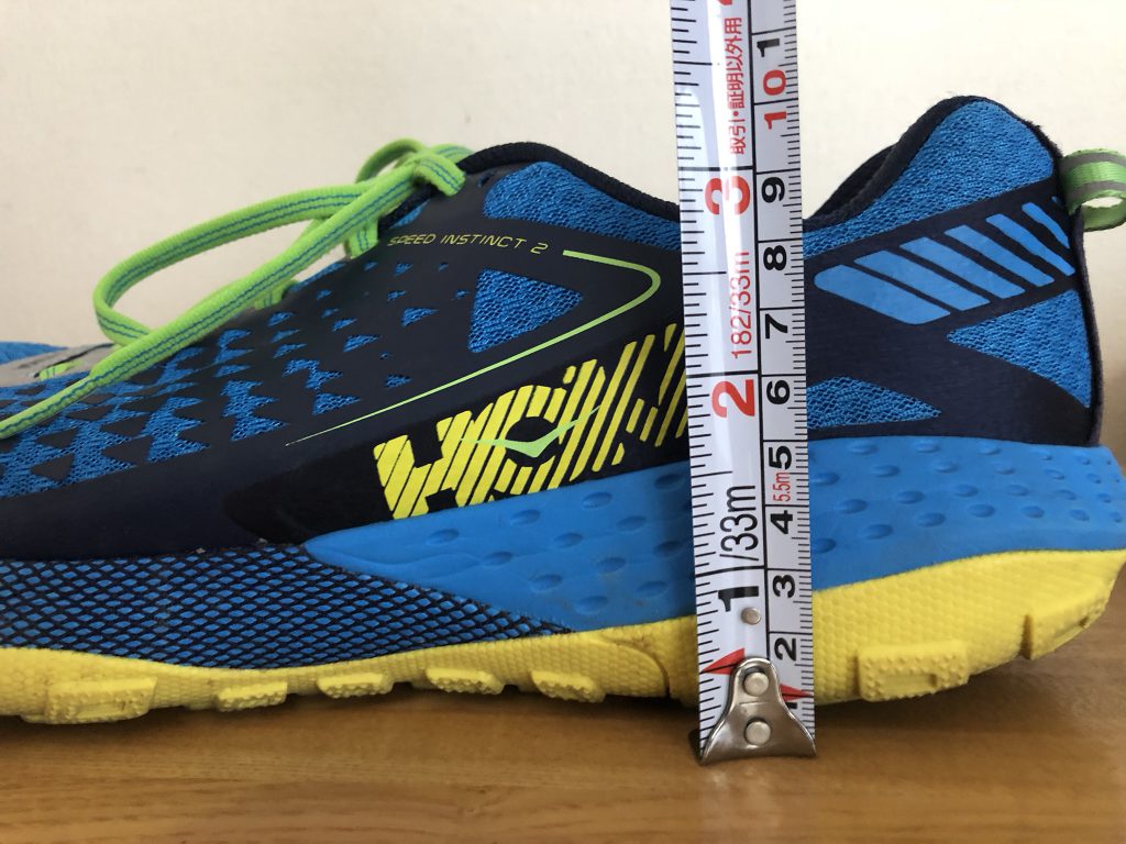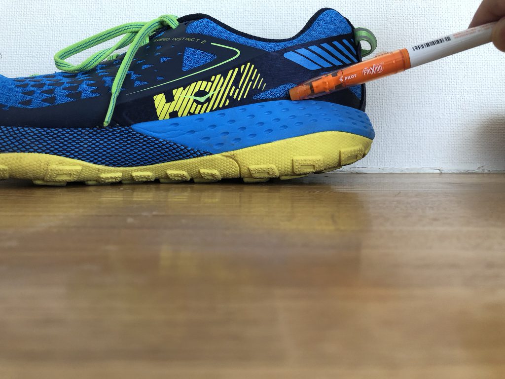 重心が高い方がシューズが転がりやすく足運びが良い傾向にある反面、接地が不安定だったり、足が上がっているときに足首に重さを感じやすいです。足の捻挫の既往がある方はこの辺要注意ですね。