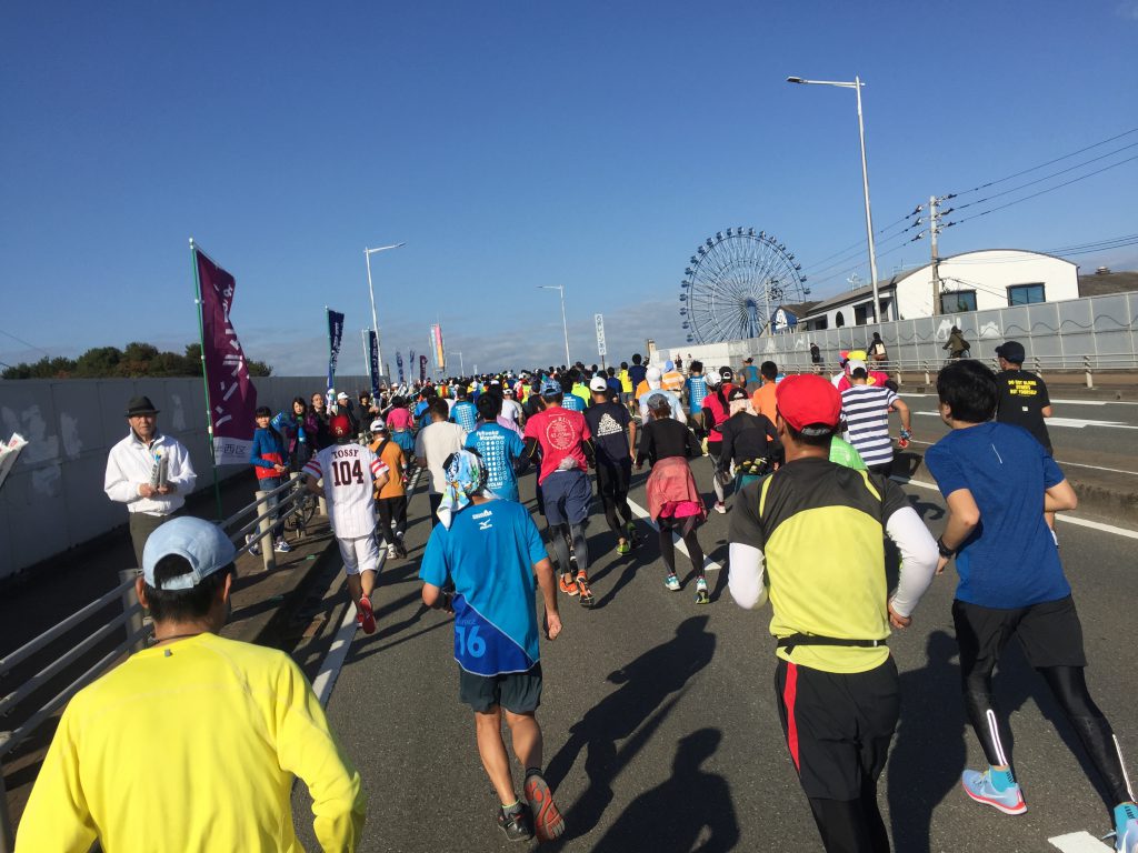(福岡マラソンでの一コマ。多くの一般ランナーの方が胸が丸まり腰が落ちてしまっています。)