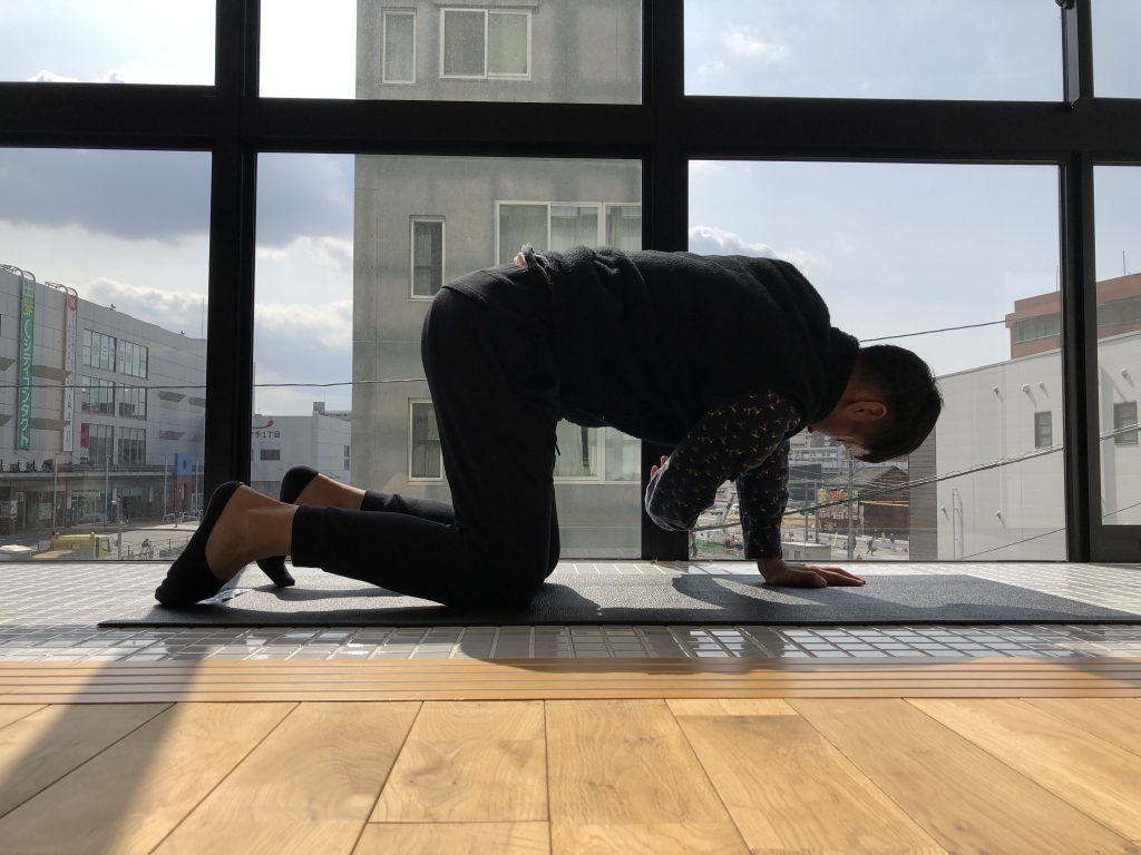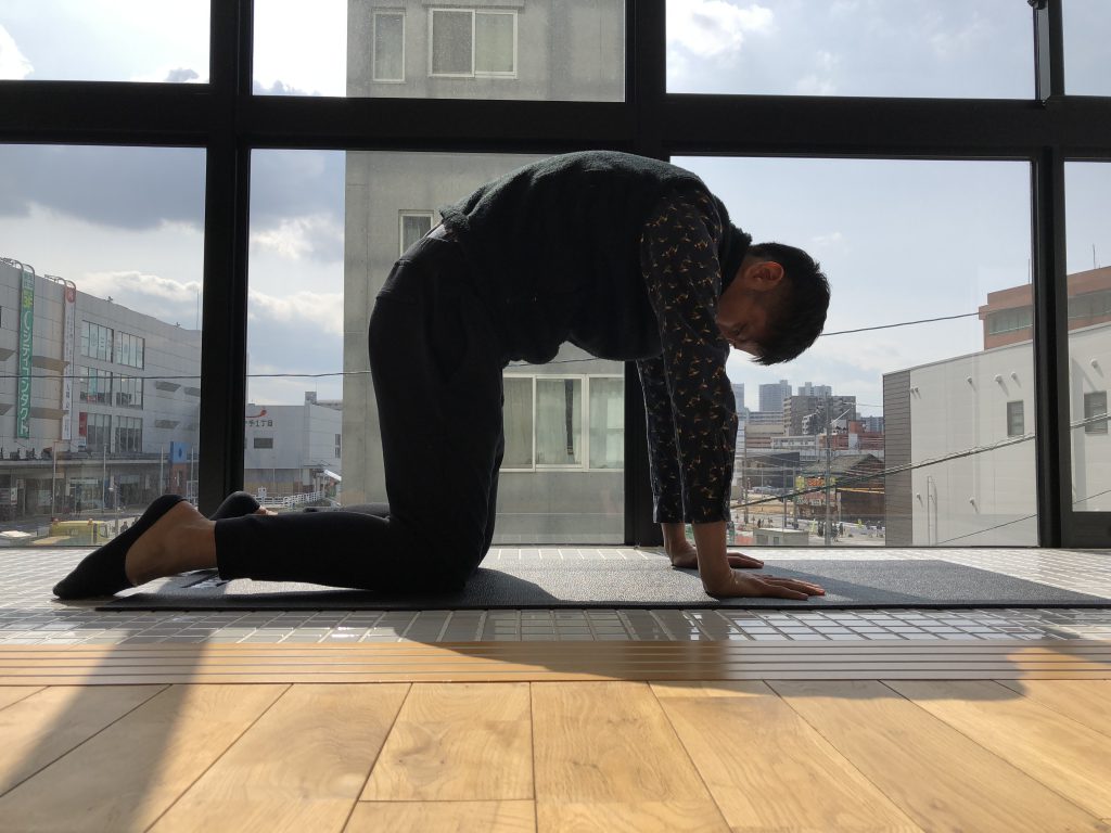 四つ這いから息を吐きながら背中を丸めていきます。このとき骨盤から動かしまず骨盤の後継を作ってから背骨全体を丸くしていくのが効果的です。