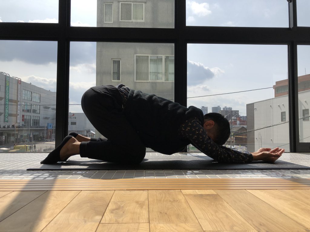 肘を下、てのひらを上に向け息を吐きながら後ろに伸びていきます。踵にお尻をつけるイメージです。余裕があれば肘同士をくっつけてしてみて下さい。