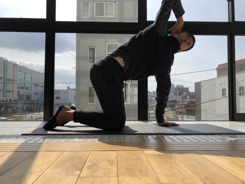 四つ這いから息を吸って右手を体の内側に。背骨を中心にひねるイメージです。