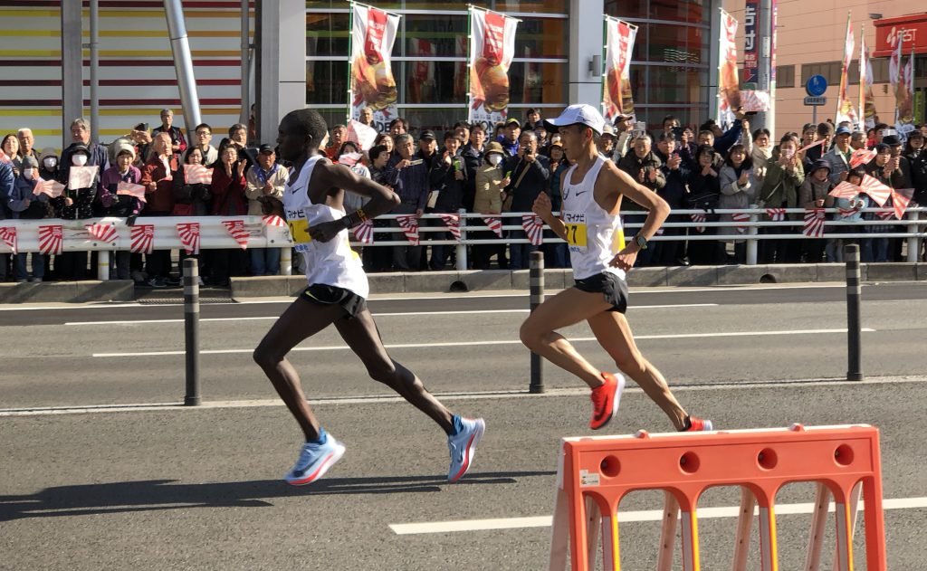 (福岡国際マラソンでのキプロティク選手と大迫選手。どちらも上半身がスッと伸びたアップライトの姿勢で前重心。)