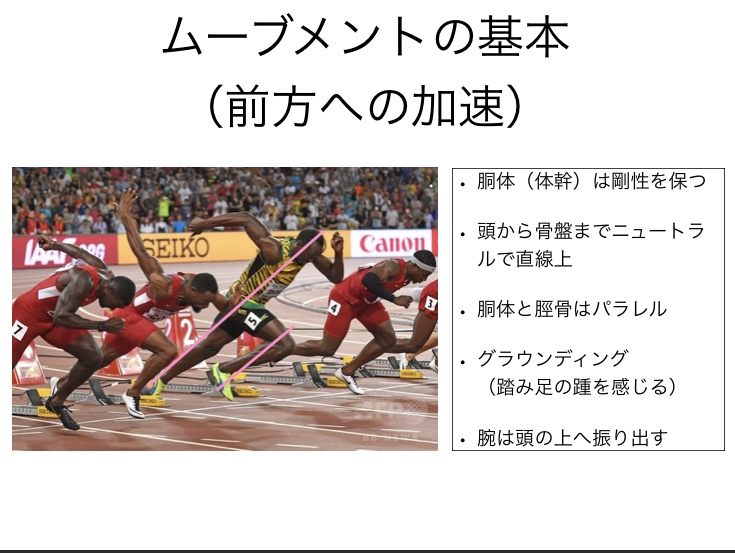 この前方への加速動作の基本は歩行時もある程度同じことが言えます。
