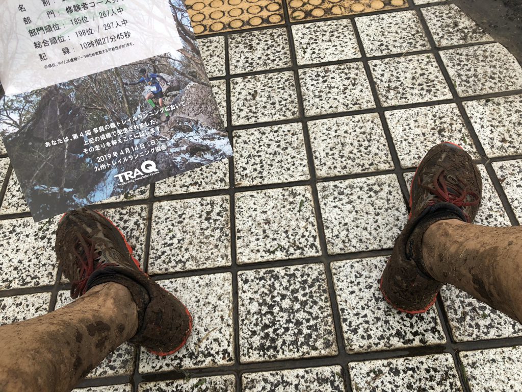 ラストは郡岳からゴールまでの下り5kmを30分でスパート、途中泥の中あえて足を滑らせながら下るというスキルも習得!制限時間2分前にどうにかゴール出来ました!