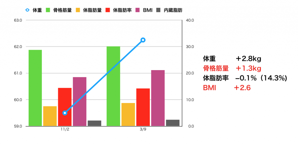 ですが、個人的に一般的に健康な人をターゲットとする場合、体重減より体重増が難しいと感じているのでこの変化はやっぱり嬉しいですね(^^)