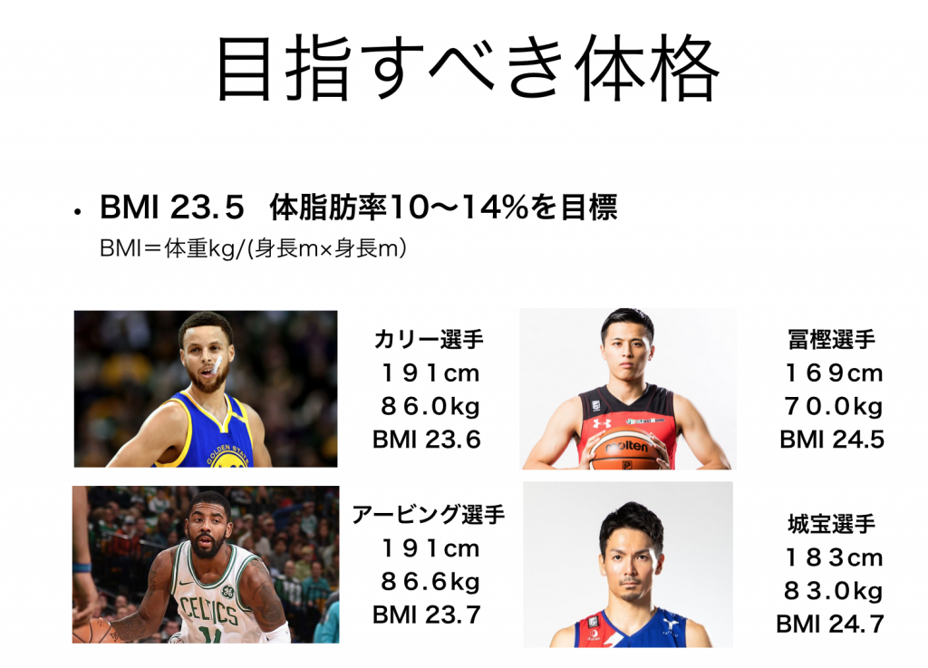 NBAやBリーグのトップ選手ですのでこの数値はあくまで目標になりますが、メディアでよく見る選手の体格をイメージしながら体重増加後になりたい体格のイメージを持ってもらいました。