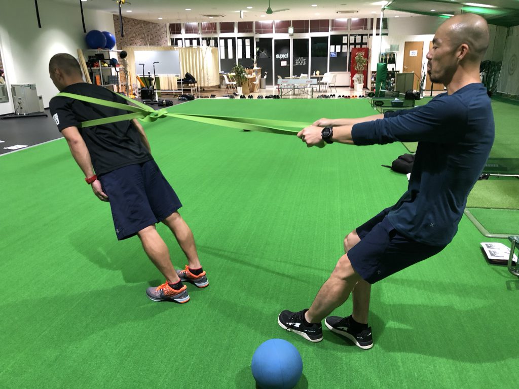 他のバリエーションとして重りを使っての前方へのプッシュ動作も行いました。
