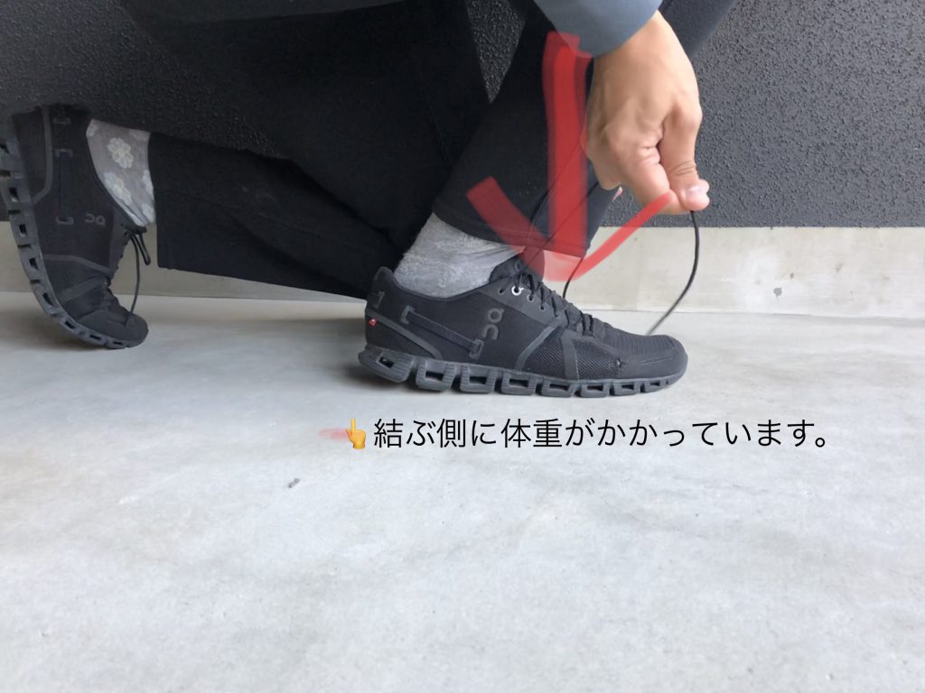 結ぶ側の足に体重をかけたまま靴ひもを結んでしまわないように気をつけましょう。